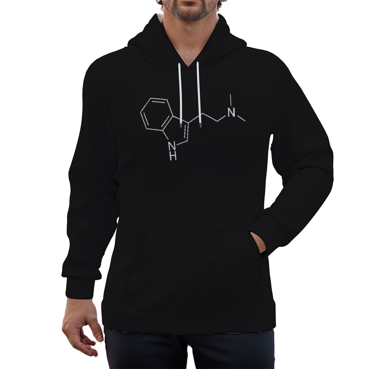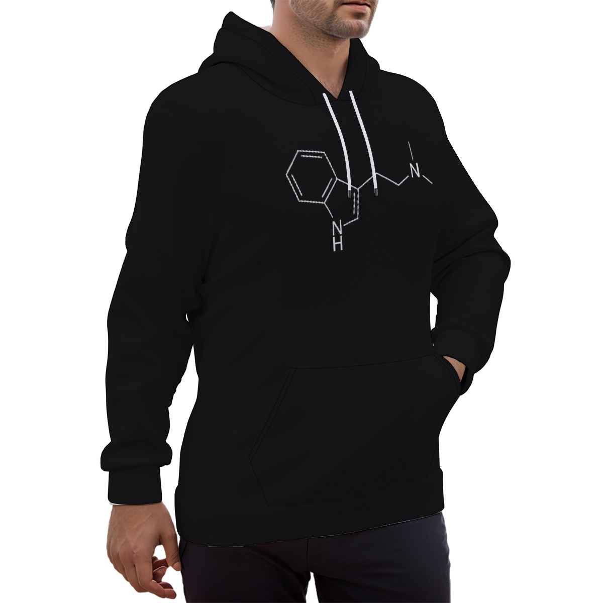 - White drawstring, front pocket and black inner hood